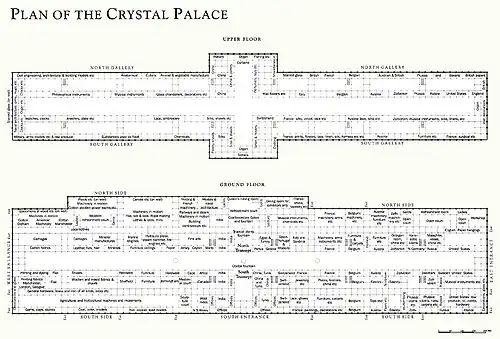 By multiplying these modules into a grid, the structure could be extended virtually indefinitely. In its original form, the ground level of the Crystal Palace (in plan) measured 1,848 feet (563 m) by 456 feet (139 m), which equates to a grid 77 modules long by 19 modules wide.[18] As each module was self-supporting, Paxton was able to leave out modules in some areas, creating larger square or rectangular spaces within the building to accommodate larger exhibits. On the lower level, these larger spaces were covered by the floor above, and on the upper level by longer spans of roofing, but the dimensions of these larger spaces were always multiples of the basic 24 feet (7.3 m) by 24 feet (7.3 m) grid unit.