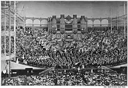 In the central transept was the 4,000-piece Grand Orchestra built around the 4,500-pipe Great Organ. There was a concert room with over 4,000 seats that hosted successful Handel Festivals for many years and August Manns's Crystal Palace Concerts from 1855 until 1901.[41] The performance spaces hosted concerts, exhibits, and public entertainment.[6] Many famous people visited the Crystal Palace especially during its early years, including the likes of Emma Darwin, the wife of Charles Darwin who noted in her diary on 10 June 1854, "Opening Crystal Pal".[43]