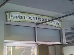 The host sits at his desk on the elevated island stage in the style of a traditional news show. The show initially used New York PBS station WNET's facilities until late 1998, when it moved a few blocks to NEP Studio 54. The Colbert Report would claim NEP Studio 54 in 2005.[38][39] On July 11, 2005, the show premiered in its new studio, NEP Studio 52, at 733 11th Avenue, a few blocks west of its former location.[40] The set of the new studio was given a sleeker, more formal look, including a backdrop of three large projection screens. The traditional guests' couch, which had been a part of the set since the show's premiere, was done away with in favor of simple upright chairs. The change was initially not well-received, spawning a backlash among some fans and prompting a "Bring Back the Couch" campaign. The campaign was mentioned on subsequent shows by Stewart and supported by Daily Show contributor Bob Wiltfong.[41][42] The couch was eventually featured in a sweepstakes in which the winner received the couch, round-trip tickets to New York, tickets to the show, and a small sum of money.[43]