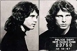 On December 9, 1967, the Doors performed a now-infamous concert at New Haven Arena in New Haven, Connecticut, which ended abruptly when Morrison was arrested by local police.[57] Morrison became the first rock artist to be arrested onstage during a live performance.[58][59] Prior to the start of the concert, Morrison was either having a private conversation with[60] or kissing a female fan backstage in a bathroom shower stall when a police officer happened upon them.[61] Unaware that he was the lead singer of the band, the officer told Morrison and the fan to leave, to which Morrison said, "Eat it." The policeman took out a can of mace and warned Morrison, "Last chance", to which Morrison replied, "Last chance to eat it."[62][63] There is some discrepancy as to what happened next: according to No One Here Gets Out Alive, the fan ran away and Morrison was maced; but Manzarek recounts in his book that both Morrison and the fan were sprayed.[62][64][65]