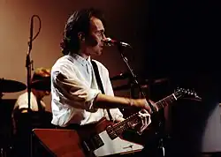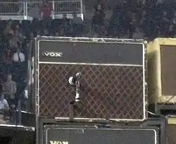 The Edge developed his playing style during his teenage years, partially as a result of him and Mullen trying to accommodate the "eccentric" bass playing of Clayton by being the timekeepers of the band.[27] In their early days, the Edge's only guitar was his 1976 Gibson Explorer Limited Edition,[41][50] which became a signature of the group.[51] However, he found the sound of the Explorer's bass strings unsatisfactory and avoided them in his playing early on, resulting in a trebly sound. He said by focusing "on one area of the fretboard [he] was developing a very stylized way of doing something that someone else would play in a normal way".[5] Other equipment choices contribute to the Edge's unique sound. His 1964 Vox AC30 "Top Boost" amplifier (housed in a 1970s cabinet) is favoured for its "sparkle" tone, and is the basis for his sound both in the studio and live.[45] The Edge has also used plectrums manufactured by the German company Herdim that he turns sideways or upside down so the dimpled grip strums against the strings, resulting in a "rasping top end" to his guitar tone.[24]