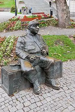Švejk is the subject of films, plays, an opera, a musical, comic books, and statues, even the theme of restaurants in a number of European countries. The novel is also the subject of an unpublished operetta by Peter Gammond. Švejk has many statues and monuments, for example, at Humenné in Slovakia; Przemyśl and Sanok in Poland; St. Petersburg, Omsk, and Bugulma in Russia and Kyiv, Lviv, and Donetsk in Ukraine. In Kraków, there is a plaque on a building where the author was imprisoned for 7 days for vagrancy by the Austrian authorities. There has been speculation that Hašek got the idea for Švejk at that time, based on one of his fellow prisoners in the jail.[14] The first statue of Švejk in the Czech Republic was unveiled in August 2014, in the village of Putim in South Bohemia.[15]