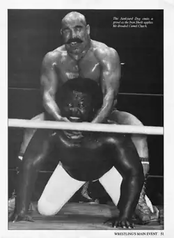 The Iron Sheik using his signature "Camel Clutch" submission hold on the Junkyard Dog.