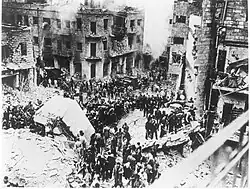 On the evening of 1 February 1948, a stolen British police car loaded with half a ton of TNT pulled up in front of the Jerusalem office of the Palestine Post on Solel Street (now Hahavazelet).[16] The driver of a second car arrived a few minutes later, lit the fuse and drove off.[17] The building also contained other newspaper offices, the British press censor, the Jewish settlement police, and a Haganah post with a cache of weapons. Arab leader Abd al-Qadir al-Husayni claimed responsibility for the bombing, but historian Uri Milstein reported that the bomb had been prepared by the Nazi-trained Fawzi el-Kutub, known as "the engineer", with the involvement of two British army deserters, Cpl. Peter Mersden and Capt. Eddie Brown.[18][19] Four people were killed in the bombing, including three Post employees.[20] According to the Palestine Post at the time, a newspaper typesetter and two people who lived in a nearby block of flats died.[21] Dozens of others were injured and the printing press was destroyed. The morning paper came out in a reduced format of two pages, printed at a small print shop nearby.[17]
