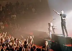 Keuning and Flowers played their first live show together at an open mic night at the Cafe Espresso Roma in Las Vegas in January 2002.[11] The pair, joined by Neal and Norcross, began playing venues around the city where they handed out free copies of their demo.[10] The Killers brought a unique style to the small Vegas music scene, which was dominated by punk, nu metal, and rap bands; one local reviewer wrote, "The Killers, thankfully, don't come across like any other band in town", and described their sound as a mix between the "pop styles of British music and the lo-fi fuzz of modern indie rock".[12] By the summer of 2002, the Killers, whose early live sound was also described as erratic, had fired Norcross and briefly replaced him with Brian Havens, who was also eventually fired. Neal later left the band for personal reasons.[10]