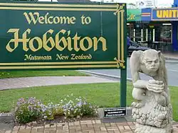 "Welcome to Hobbiton" sign in Matamata, New Zealand, where Peter Jackson's film version was shot
