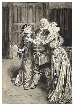 The Merry Wives of Windsor or Sir John Falstaff and the Merry Wives of Windsor[1] is a comedy by William Shakespeare first published in 1602, though believed to have been written in or before 1597. The Windsor of the play's title is a reference to the town of Windsor, also the location of Windsor Castle in Berkshire, England. Though nominally set in the reign of Henry IV or early in the reign of Henry V, the play makes no pretence to exist outside contemporary Elizabethan-era English middle-class life. It features the character Sir John Falstaff, the fat knight who had previously been featured in Henry IV, Part 1 and Part 2. It has been adapted for the opera at least ten times. The play is one of Shakespeare's lesser-regarded works among literary critics. Tradition has it that The Merry Wives of Windsor was written at the request of Queen Elizabeth I, who watching Henry IV, Part 1, is said to have asked Shakespeare to write a play depicting Falstaff in love.