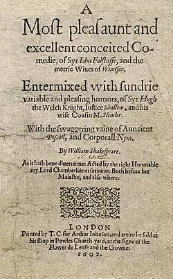 ![]() The title page of the 1602 edition: A most pleasant and excellent conceited comedy, of Sir John Falstaff, and the merry Wives of Windsor. Entermixed with the sundry variable and pleasing humours of Sir Hugh the Welsh knight, Justice Shallow and his wise Cousin M. Slender. With the swaggering vaine of ancient Pistoll, and corporal Nym. |