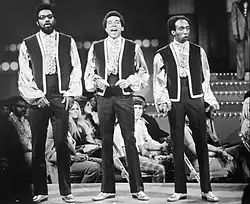 Around this time, the group had begun performing in nightclubs and other high-profile venues after years on the Chitlin' Circuit. According to an Ebony article on the group, the group began grossing $150,000 a year due to royalties and personal investments.[44] They also were making between $100,000 and $250,000 for nightly shows.[44] In addition, the Miracles appeared on many of the popular variety television programs of the period, including The Ed Sullivan Show, Shindig!, Hullabaloo, American Bandstand, Where The Action Is, The Mike Douglas Show, The Andy Williams Show,Teen Town,Hollywood A Go-Go, Upbeat, and Britain's Ready Steady Go!. The Miracles' success continued with several hits including "(Come 'Round Here) I'm the One You Need", "More Love", "Special Occasion", "If You Can Want", and the Top 10 hit "I Second That Emotion". Around this time, the group was starting to be billed as Smokey Robinson and the Miracles on several of their albums. The name change did not appear on their singles until the release of "The Love I Saw in You Was Just a Mirage", a Top 20 hit released in 1967. On that song's flipside was the tune "Come Spy with Me". The Miracles sang the original theme to the 1967 20th Century Fox film of the same name.[45][46][47]