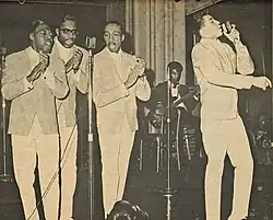 The group that later became the Miracles was formed in 1955 by five teenage friends from Detroit, Michigan, under the name the Five Chimes.[7] Three of the founding members, Smokey Robinson, Warren "Pete" Moore, and Ronnie White, had been singing together since they each were around the age of eleven.[7] The group, influenced by acts such as Billy Ward and His Dominoes and Nolan Strong & the Diablos, featured Clarence Dawson and James Grice in the original lineup.[7] All of the group's original members attended Northern High School in Detroit.[7] After Dawson quit the group and Grice dropped out to get married, they were replaced by Emerson "Sonny" Rogers and his cousin Bobby and changed their name to the Matadors.[8] Coincidentally, both Smokey Robinson and Bobby Rogers were born in the same hospital on the same date (February 19, 1940), despite not actually meeting each other until they were fifteen.[7][9] In 1957, Sonny Rogers left to join the United States Army and Claudette Rogers, his sister, who had been singing with the sister group the Matadorettes, joined them shortly afterwards, and in 1958, the group became the Miracles.[8] Following two years of courtship, Smokey and Claudette married in November 1959.