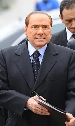 On 1 August 2013 Berlusconi was convicted for tax evasion and sentenced to four years of imprisonment, the last three being automatically pardoned.[102] On 18 September, when discussing the enactment of a related six-year public office ban, as required by the "Severino law", the Senate committee in charge of elections refused to endorse a PdL resolution relinquishing Berlusconi's ban, as both the PD and the M5S disagreed.[103] On the same day Berlusconi launched the new Forza Italia (FI) and pledged to stay on as its leader in any case.[104] The would-be PdL coalition might include the new FI, Lega Nord and other parties. In fact, in disagreement with the new FI's liberalism, some members led by former mayor of Rome Gianni Alemanno, who left the PdL in October 2013,[105] might form a conservative party modelled on the late National Alliance (AN), along with Brothers of Italy and other minor right-wing parties, and eventually join the coalition.[106][107][108][109]