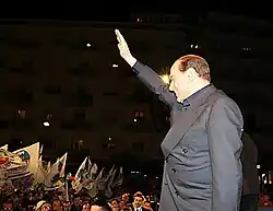 On 18 November 2007, Berlusconi claimed that his supporters had collected over 7 million signatures on an appeal demanding the President of the Republic, Giorgio Napolitano, to call a fresh general election. Shortly afterwards, from the running board of a car in a crowded Piazza San Babila in Milan,[18] he announced that FI would soon merge or transform into a new "party of the Italian people".[19] The new course was thus called the "running board revolution" (rivoluzione del predellino) and this expression soon became very popular both among Berlusconi's supporters and his adversaries.[20][21]