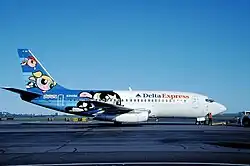 Delta Express promoted the series by having a Boeing 737-232 jet painted with a special livery featuring the characters Blossom, Bubbles, and Buttercup on its exterior.[91] The plane's inaugural flight was held at Logan International Airport in Boston, Massachusetts, on July 17, 2000.[92] It was approved to serve in 21 airports.[93] In 2002 the aircraft was repainted with a different Powerpuff Girls theme to promote The Powerpuff Girls Movie.[94]