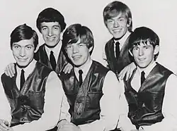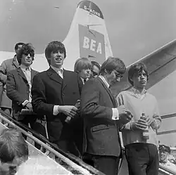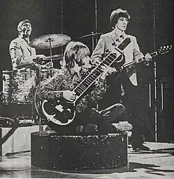 During the tour, the band recorded their second single, a Lennon–McCartney song, "I Wanna Be Your Man".[59][60] It reached number 13 on the UK charts.[61] The Beatles' own recording of the song is included on the 1963 album With the Beatles.[62] On 1 January 1964, the Stones' were the first band to play on BBC's Top of the Pops, performing "I Wanna Be Your Man".[63] In January 1964 the band released a self-titled EP, which became their first number 1 record in the UK.[64] The third single by the Stones, Buddy Holly's "Not Fade Away", reflecting Bo Diddley's style, was released in February 1964 and reached number 3.[65]