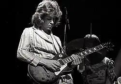 The Stones needed a new guitarist, and the recording sessions in Munich for the next album, Black and Blue (1976) (number 2 in the UK, number 1 in the US), were effectively used as auditions. Guitarists as stylistically disparate as Peter Frampton and Jeff Beck were auditioned, as well as Robert A. Johnson and Shuggie Otis. Both Beck and Irish blues rock guitarist Rory Gallagher later claimed they had played without realising they were being auditioned. American session players Wayne Perkins and Harvey Mandel also tried out, but Richards and Jagger preferred for the band to remain purely British. When Faces guitarist Ronnie Wood auditioned, everyone agreed he was the right choice.[206] He had already recorded and played live with Richards, and had contributed to the recording and writing of the track "It's Only Rock 'n Roll". He had declined Jagger's earlier offer to join the Stones, because of his commitment to Faces, saying "that's what's really important to me".[207] Faces' lead singer Rod Stewart went so far as to say he would take bets that Wood would not join the Stones.[207]