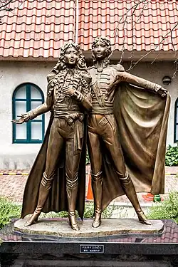 The all-female theater revue the Takarazuka Revue has dramatized The Rose of Versailles multiple times since 1974. The show's role in Takarazuka history is particularly notable, as it triggered a significant surge in the revue's popularity and established its "Top Star" system of assigning lead roles.[52] From 1974 to 1976, all four Takarazuka troupes staged The Rose of Versailles, drawing a total audience of 1.6 million; the revue's 1986 production alone drew an audience of 2.1 million.[53] In 2024, a Korean adaption debuted at the Chungmu Art Center, Seoul.[54]