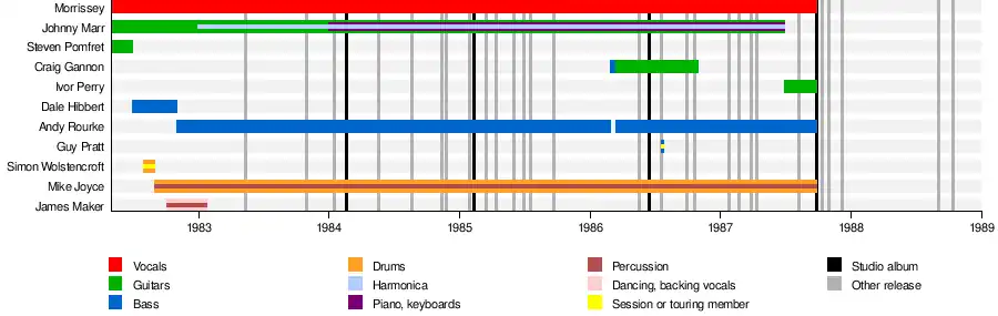 ![]() The Smiths in 1984. From left to right: Andy Rourke, Morrissey, Johnny Marr and Mike Joyce. | |