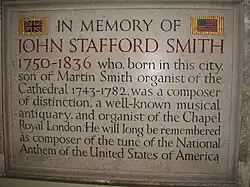 A memorial to John Stafford Smith in Gloucester Cathedral in Gloucester, England
