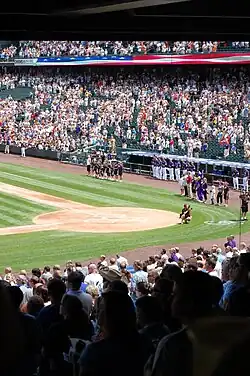 Crowd performing the U.S. national anthem before a baseball game at Coors Field in Denver