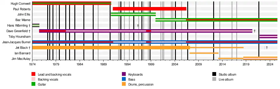 - Hugh Cornwell – lead and backing vocals, guitar (1974–1990)