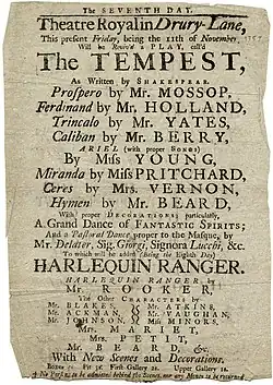 The entire First Folio project was delivered to the blind printer, William Jaggard, and printing began in 1622.[30] The Tempest is the first play in the publication. It was proofread and printed with special care; it is the most well-printed and the cleanest text of the thirty-six plays. To do the work of setting the type in the printing press, three compositors were used for The Tempest. In the 1960s, a landmark bibliographic study of the First Folio was accomplished by Charlton Hinman. Based on distinctive quirks in the printed words on the page, the study was able to individuate the compositors, and reveal that three compositors worked on The Tempest, who are known as Compositor B, C, and F. Compositor B worked on The Tempest's first page as well as six other pages. He was an experienced journeyman in Jaggard's printshop, who occasionally could be careless. In his role, he may have had a responsibility for the entire First Folio. The other two, Compositors C and F, worked full-time and were experienced printers.[27]