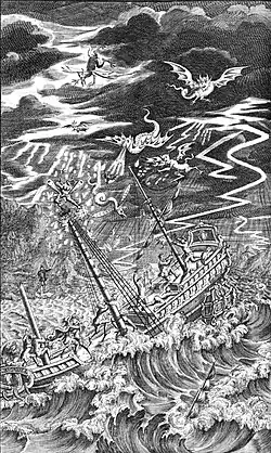 The Sea Venture: William Strachey's A True Reportory of the Wracke and Redemption of Sir Thomas Gates, Knight, an eyewitness report of the real-life shipwreck of the Sea Venture in 1609 on the island of Bermuda while sailing toward Virginia, may be considered a primary source for the opening scene, as well as a few other references in the play to conspiracies and retributions.[7] Although not published until 1625, Strachey's report was first recounted in his "Letter to an Excellent Lady", a private letter describing the incident and the earliest account of all. It was dated 15 July 1610, and it is thought that Shakespeare - who had personal connections with a number of members of the Virginia Company - may have seen the original sometime during that year.[8][9] At around the time Shakespeare could have read Strachey's letter, another Sea Venture survivor, Silvester Jourdain, published his account, A Discovery of The Barmudas, otherwise Called the Ile of Divels.[10] Also there is the Council of Virginia's 1610 pamphlet True Declaration of the state of the Colonie in Virginia, with a confutation of such scandalous reports as have tended to the disgrace of so worthy an enterprise.[11] Regarding the influence of Strachey on the play, Kenneth Muir says that although "there is little doubt that Shakespeare had read ... William Strachey's True Reportory" and other accounts, "the extent of the verbal echoes of [the Bermuda] pamphlets has, I think, been exaggerated. There is hardly a shipwreck in history or fiction which does not mention splitting, in which the ship is not lightened of its cargo, in which the passengers do not give themselves up for lost, in which north winds are not sharp, and in which no one gets to shore by clinging to wreckage."[12]