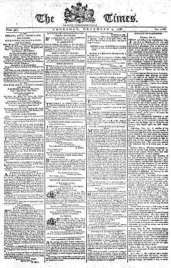 The Times was founded by publisher John Walter (1738–1812) on 1 January 1785 as The Daily Universal Register,[13] with Walter in the role of editor.[14] Walter had lost his job by the end of 1784 after the insurance company for which he worked went bankrupt due to losses from a Jamaican hurricane. Unemployed, Walter began a new business venture.[15][16] At that time, Henry Johnson invented the logography, a new typography that was reputedly faster and more precise (although three years later, it was proved less efficient than advertised). Walter bought the logography's patent and, with it, opened a printing house to produce books.[16] The first publication of The Daily Universal Register was on 1 January 1785. Walter changed the title after 940 editions on 1 January 1788 to The Times.[13][16] In 1803, Walter handed ownership and editorship to his son of the same name.[16] Walter Sr's pioneering efforts to obtain Continental news, especially from France, helped build the paper's reputation among policy makers and financiers,[17] in spite of a sixteen-month incarceration in Newgate Prison for libels printed in The Times.[16]