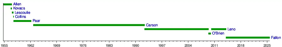 | Jack Paar | July 29, 1957 | March 30, 1962 | 4 years, 8 months and 2 days | |