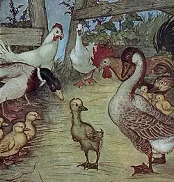An alternate version of the tale ("The Blue Hen's Chicken"[4]) was included in Joel Chandler Harris's Mr. Rabbit at Home. A Sequel to Little Mr. Thimblefinger and His Queer Country (1895). Since the story stops at the moment of the birth of the puddle duckling within the family of chicks, the message of the tale could be totally different, focusing on the "bad temper" and the snobbery of the Blue Hen who thus - having found herself with a such an anomalous son - is punished by ending up on everyone's lips and constantly being pointed at.