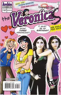 A settlement was reached that included a cross-promotion deal, including an appearance in an issue of Veronica's series.[17] The issue (Veronica #167, released on 1 March 2006) featured the Veronicas in the feature story, What's In A Name?, in which they meet Lodge, perform in Riverdale and spend a day there, as well as a card with a code allowing a free download of their single "4ever" in MP3 form.[18] A few months later, Archie and Friends (No. 100) featured the Archies meeting the Veronicas.[19] The next issue of Archie and Friends (No. 101) also featured the Veronicas, with Archie as their biggest fan.[20]