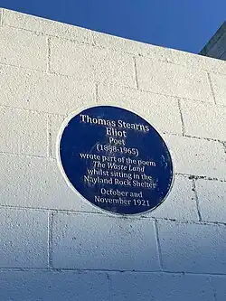 In the autumn of 1921 Eliot and Vivienne travelled to the coastal resort of Margate.[34] Eliot had been recommended rest following a diagnosis of some form of nervous disorder, and had been granted three months' leave from the bank where he was employed, so the trip was intended as a period of convalescence. Eliot worked on what would become The Waste Land while sitting in the Nayland Rock shelter on Margate Sands, producing "some 50 lines", and the area is referenced directly in "The Fire Sermon" ("On Margate Sands / I can connect / Nothing with nothing.")[35][36] The couple travelled to Paris in November, where Eliot showed an early version of the poem to Pound.[37] Pound had become acquainted with Eliot seven years previously, and had helped get some of Eliot's previous work published.[38] Eliot was travelling on to Lausanne for treatment by Dr Roger Vittoz, who had been recommended to him by Ottoline Morrell;[35][39] Vivienne was to stay at a sanatorium just outside Paris.[37] While under Vittoz's care, Eliot completed the first draft of The Waste Land.[40]
