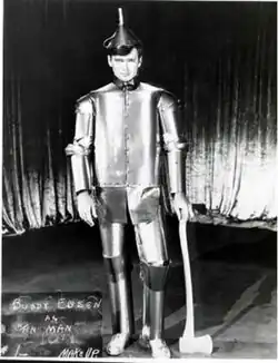 The production faced the challenge of creating the Tin Man's costume. Several tests were done to find the right makeup and clothes for Ebsen.[41] Ten days into the shoot, Ebsen suffered a toxic reaction after repeatedly inhaling the aluminum dust (which his daughter, Kiki Ebsen, has said the studio misrepresented as an "allergic reaction") contained in the aluminum powder makeup he wore. He recalled taking a breath one evening, and "nothin' happened," Ebsen's way of saying he wasn't receiving any air into his system. He was hospitalized in critical condition. He spent two weeks on oxygen and was subsequently forced to leave the project.[42][43] In a later interview (included on the 2005 DVD release of The Wizard of Oz), he recalled that the studio heads appreciated the seriousness of his illness only after he was hospitalized. Filming halted while a replacement for him was sought.