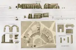 Luigi Canina (1795–1856) was the first to undertake serious research on the theatre. Canina examined what ruins he could and then combined this information with Vitruvius' famous description of a Roman theatre, thereby producing a working plan of the theatre. Later in 1837, Victoire Baltard used Canina's work, as well as information gleaned from the Forma Urbis to construct a more refined plan.[36] Much like Piranesi before him, Baltard also created a sketch of what the ruins would look like were they to be completely excavated.[37]