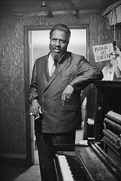 Monk put his first band together at the age of 16, getting a few restaurant and school gigs.[13] At 17, Monk toured with an evangelist, playing the church organ, and in his late teens he began to find work playing jazz.[14] In the early to mid-1940s, he was the house pianist at Minton's Playhouse, a Manhattan nightclub.[14] Much of Monk's style (in the Harlem stride tradition) was developed while he performed at Minton's where he participated in after-hours cutting contests, which featured many leading jazz soloists of the time. Monk's musical work at Minton's was crucial in the formulation of bebop, which would be furthered by other musicians, including Dizzy Gillespie, Charlie Christian, Kenny Clarke, Charlie Parker, and, later, Miles Davis.[15] Monk is believed to be the pianist featured on recordings Jerry Newman made around 1941 at the club. Monk's style at this time was later described as "hard-swinging", with the addition of runs in the style of Art Tatum. Monk's stated influences included Duke Ellington, James P. Johnson, and other early stride pianists. According to the documentary Thelonious Monk: Straight, No Chaser, Monk lived in the same neighborhood in New York City as Johnson and knew him as a teenager.