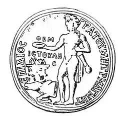 It was rumored that after his death, Themistocles's bones were transported to Attica in accordance with his wishes, and buried in his native soil in secret, it being illegal to bury an Athenian traitor in Attica.[102] The Magnesians built a "splendid tomb" in their marketplace for Themistocles, which still stood during the time of Plutarch, and continued to dedicate part of their revenues to the family of Themistocles.[12] Nepos in the 1st century BC wrote about a statue of Themistocles visible in the forum of Magnesia.[121][122] The statue also appears on a coin type of Roman emperor Antoninus Pius minted in Magnesia in the 2nd century CE.[115][116]
