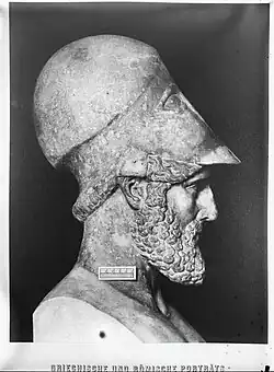 Themistocles also had three other sons, Diocles, Polyeucteus and Cleophantus, the latter possibly a ruler of Lampsacus.[121] One of the descendants of Cleophantus still issued a decree in Lampsacus around 200 BC mentioning a feast for his own father, also named Themistocles, who had greatly benefited the city.[130] Later, Pausanias wrote that the sons of Themistocles "appear to have returned to Athens", and that they dedicated a painting of Themistocles in the Parthenon and erected a bronze statue to Artemis Leucophryene, the goddess of Magnesia, on the Acropolis.[131][132][133] They may have returned from Asia Minor in old age, after 412 BC, when the Achaemenids took again firm control of the Greek cities of Asia, and they may have been expelled by the Achaemenid satrap Tissaphernes sometime between 412 and 399 BC.[131] In effect, from 414 BC, Darius II had started to resent increasing Athenian power in the Aegean and had Tissaphernes enter into an alliance with Sparta against Athens, which in 412 BC led to the Persian conquest of the greater part of Ionia.[134]