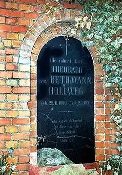 Theobald von Bethmann Hollweg was born at Hohenfinow in Brandenburg, then part of the Kingdom of Prussia. He was the son of Prussian official Felix von Bethmann Hollweg. His grandfather August von Bethmann-Hollweg had been a prominent law scholar, president of Frederick William University in Berlin and Prussian minister of culture. His great-grandfather Johann Jakob Hollweg had married a daughter of the wealthy Frankfurt am Main banking family of Bethmann.[1] His mother, Isabella de Rougemont, was a French Swiss and his grandmother Auguste Wilhelmine Gebser came from the Prussian noble family of Gebesee.