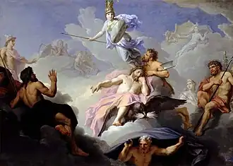 Zeus, by Gaia's advice, was elected king of the gods, and he distributed various honors among the gods.[25] Zeus then married his first wife Metis, but when he learned that Metis was fated to produce a son which might overthrow his rule, by the advice of Gaia and Uranus, Zeus swallowed Metis (while still pregnant with Athena). And so Zeus managed to end the cycle of succession and secure his eternal rule over the cosmos.[26]
