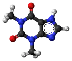 Theophylline, also known as 1,3-dimethylxanthine, is a drug that inhibits phosphodiesterase and blocks adenosine receptors.[1] It is used to treat chronic obstructive pulmonary disease (COPD) and asthma.[2] Its pharmacology is similar to other methylxanthine drugs (e.g., theobromine and caffeine).[1] Trace amounts of theophylline are naturally present in tea, coffee, chocolate, yerba mate, guarana, and kola nut.[1][3]