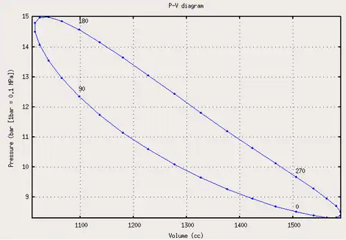 | Ideal Stirling cycle | Actual performance | Actual and ideal overlaid, showing difference in work output |