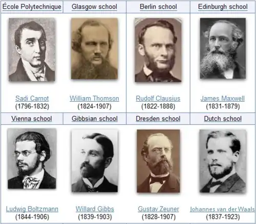 The thermodynamicists of the original eight founding schools of thermodynamics. The schools with the most-lasting influence on the modern versions of thermodynamics are the Berlin school, particularly Rudolf Clausius's 1865 textbook The Mechanical Theory of Heat, the Vienna school, with the statistical mechanics of Ludwig Boltzmann, and the Gibbsian school at Yale University of Willard Gibbs' 1876 and his book On the Equilibrium of Heterogeneous Substances which launched chemical thermodynamics.[9]