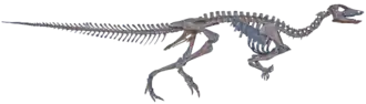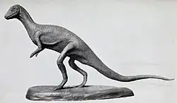 In his 1915 description, Gilmore suggested that Thescelosaurus was an agile, bipedal (two-legged) animal and was adapted for running. He also created a model to depict its life appearance, showing a light and agile body built with slender hind limbs.[7] These ideas were contested by Sternberg in 1940, who argued that the skeleton, and especially the limbs, were robust. His own model, of the species T. edmontonensis, consequently showed limbs that were much more muscular.[2] Other subsequent studies disagreed with Gilmore idea of a proficient runner given the robust skeleton, the proportionally long femur, and the short lower leg bones.[26] Galton, in 1974, even suggested that Thescelosaurus could have occasionally moved quadrupedally (on all fours), given its fairly long arms and wide hands.[14] Phil Senter and Jared Mackey, in 2023, concluded that a quadrupedal posture would have been theoretically possible, as the spine of the back was bent down, allowing the hand to touch the ground even when the hind limbs were straight. However, in such a posture the fingers would have pointed towards the sides rather than front, and consequently could not have been used to propel the animal forward; quadrupedal locomotion therefore seems unlikely.[54]