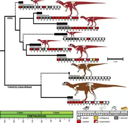 The earliest-known thescelosaurids, Changchunsaurus and Zephyrosaurus, are from the middle Cretaceous, roughly 40 million years younger than when the group would have evolved, suggesting a long ghost lineage (a period of geologic time during which a group existed but left no fossil evidence).[34] In 2024, André Fonseca and colleagues recovered the Late Jurassic Nanosaurus as the earliest thescelosaurid, which would shorten the ghost lineage.[49][52] Boyd concluded in 2015 that the split between Orodrominae and Thescelosaurinae took place in North America by the Aptian stage, with Orodrominae diversifying within North America.[34] Thescelosaurinae might have diversified either in North America or Asia;[34] the genus Fona, described in 2024, suggests that Thescelosaurinae was already established in North America at the beginning of the Late Cretaceous.[51]
