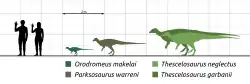 The concept of Hypsilophodontidae as a monophyletic group then fell out of favor. Rodney Sheetz suggested in 1999 that "hypsilophodontids" were simply the primitive forms of ornithopods, the larger grouping to which they were commonly assigned. Scheetz found Thescelosaurus, Parksosaurus and Bugenasaura to be successively closer to Hypsilophodon and later ornithopods, but not a group of their own.[43] Other studies had similar results, with Thescelosaurus or Bugenasaura as early ornithopods close to the origin of the group, sometimes forming a clade with Parksosaurus.[44][45][46] An issue with T. neglectus prior to the revision by Boyd and colleagues in 2009 was the uncertainty about the assigned specimens, including the separation of Bugenasaura and the unresolved question of whether T. edmontonensis was distinct or not.[46] Following their taxonomic revision, the systematic relationships of Thescelosaurus and "hypsilophodonts" have become clearer, and Boyd and colleagues found support for a larger group of early ornithopods consisting of Thescelosaurus, Parksosaurus, Zephyrosaurus, Orodromeus and Oryctodromeus.[19] Brown and colleagues, while describing T. assiniboiensis in 2011, came to similar results.[5] The same authors confirmed these results again in 2013, prompting them to reintroduce the name Thescelosauridae for the entire group, which was divided into the revised subfamily Thescelosaurinae and the new subfamily Orodrominae.[47][48]