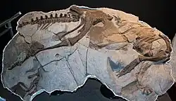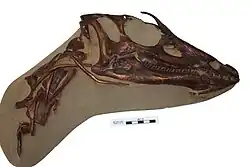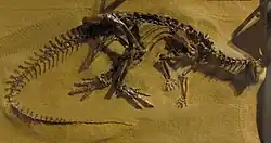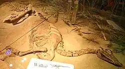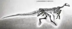 Gilmore published a comprehensive description in 1915 after the type specimen was fully prepared.[1][7] He identified six more specimens, including a shoulder blade with coracoid, a neck vertebra, and a toe bone, as well as three partial skeletons that had been collected by Barnum Brown and were stored in the American Museum of Natural History (AMNH). The neck and skull remained unknown, however, and Gilmore restored these missing parts based on Hypsilophodon, which he considered a close relative, in his skeletal and life reconstructions. For the museum display of the type specimen, Gilmore maintained its original posture and incompleteness. Only the right leg, which was slightly dislocated, was adjusted in position, and some minor damage to the bones was restored, but painted lighter than the original bones so that the real and reconstructed parts could be distinguished visually.[7] In 1963, the display was included in a wall mount alongside the ornithischians Edmontosaurus and Corythosaurus and the theropod Gorgosaurus. In 1981 the display was rearranged, placing Thescelosaurus higher and more out-of-sight. Renovations of the exhibit from 2014 to 2019 removed the Thescelosaurus and other dinosaurs on display, replacing them with plaster casts so that the original fossils could be further prepared and studied.[9]