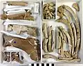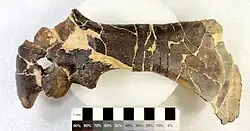 Thescelosaurus was historically thought to be relatively uncommon in its paleoenvironments.[5][8] A 1987 study estimated that hypsilophodontids (including Thescelosaurus) and pachycephalosaurs together accounted for just 2% of the dinosaur faunas of the Lance, Hell Creek, and Frenchman formations.[64][5] Two other studies, of 1998 and 2011, estimated that Thescelosaurus made up 3% and 5% of the total dinosaur fauna of the Hell Creek Formation, respectively.[65][66][5] These low figures might be the result of a sampling bias, as specimens of more spectacular dinosaurs such as Triceratops were preferentially collected,[5] and Thescelosaurus is now thought to be one of the more abundant dinosaurs.[67] A 2011 census study of an area of the Hell Creek Formation where fossils have been collected without such bias estimated that Thescelosaurus forms 8% of the dinosaur fauna.[63][8] Brown and colleagues, in 2011, estimated that Thescelosaurus was perhaps the most abundant dinosaur in the Frenchman Formation, accounting for 31% of specimens.[5] At one site in the Hell Creek Formation known as the "tooth draw deposit", Thescelosaurus accounted for 22.7% of all dinosaur bones.[68] At the 'convenience store' locality of the Frenchman Formation, Thescelosaurus even accounted for 42% of all tetrapod fossils; all Thescelosaurus specimens from this locality are very small and presumably juvenile.[5] The most common Thescelosaurus fossils that can be readily identified are the phalanges of the foot, while articulated skeletons are very rare.[32]