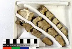 T. neglectus had 6 sacral ("hip") vertebrae and 27 presacral ("neck and back") vertebrae.[3][5] The type specimen of T. assiniboiensis appears to have had only five sacrals, but it is possible that this individual was not yet fully mature and that the last sacral was not yet fused to the other sacrals.[5] The tail was long and made up half of the total body length. It was braced by ossified tendons from the middle to the tip, which would have reduced the flexibility of the tail.[7] The rib cage was broad, giving it a wide back.[2] Large thin and flat mineralized plates have been found next to the ribs' sides, so-called intercostal plates.[31] The anterior ribs were flattened and concave, and the posterior margins of their lower ends had a rough surface. These features are autapomorphies of Thescelosaurus and are possibly adaptations that allow the plates to attach to the rib cage.[21]: 7