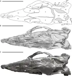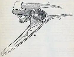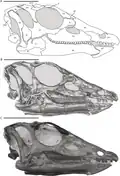 The skull had a long, low snout that ended in a toothless beak.[28][29] As in other dinosaurs, it was perforated by several fenestrae, or skull openings. Of these, the orbit (eye socket) and the infratemporal fenestra (behind the orbit) were proportionally large, while the external naris (nostril) was small.[28] The external naris was formed by the premaxilla (the front bone of the upper jaw) and the nasal bone, while the maxilla (the tooth-bearing "cheek" bone) was excluded.[21]: 18 Another fenestra, the antorbital fenestra, was in-between the external naris and the orbit and contained two smaller internal fenestrae.[21]: 20 Long rod-like bones called palpebrals were present above the eyes, giving the animal heavy bony eyebrows.[29] The palpebral was not aligned with the upper margin of the orbit as in some other ornithischians, but protruded across it.[21]: 55 The frontal bones, which form the skull roof above the orbit, were widest at the level of the middle of the orbit and narrower at their posterior (rear) ends – an autapomorphy of Thescelosaurus.[21]: 6