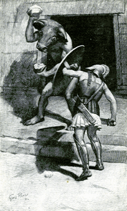 On the third occasion, Theseus volunteered to talk to the monster to stop this horror. He took the place of one of the youths and set off with a black sail, promising to his father, Aegeus, that if successful he would return with a white sail.[iv] Like the others, Theseus was stripped of his weapons when they sailed. On his arrival in Crete, Ariadne, King Minos's daughter, fell in love with Theseus and, on the advice of Daedalus, gave him a ball of thread (a clew), so he could find his way out of the Labyrinth.[v] That night, Ariadne escorted Theseus to the Labyrinth, and Theseus promised that if he returned from the Labyrinth he would take Ariadne with him. As soon as Theseus entered the Labyrinth, he tied one end of the ball of string to the doorpost and brandished his sword which he had kept hidden from the guards inside his tunic. Theseus followed Daedalus's instructions given to Ariadne: go forwards, always down, and never left or right. Theseus came to the heart of the Labyrinth and upon the sleeping Minotaur. The beast awoke and a tremendous fight occurred. Theseus overpowered the Minotaur with his strength and stabbed the beast in the throat with his sword (according to one scholium on Pindar's Fifth Nemean Ode, Theseus strangled it).[10]