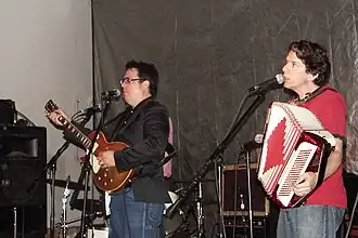 They Might Be Giants, often abbreviated as TMBG, is an American alternative rock band formed in 1982 by John Flansburgh and John Linnell. During TMBG's early years, Flansburgh and Linnell frequently performed as a musical duo, often accompanied by a drum machine. In the early 1990s, TMBG expanded to include a backing band.[6] The duo's current backing band consists of Marty Beller, Dan Miller and Danny Weinkauf. They have been credited as vital in the creation and growth of the prolific DIY music scene in Brooklyn in the mid-1980s.[7]